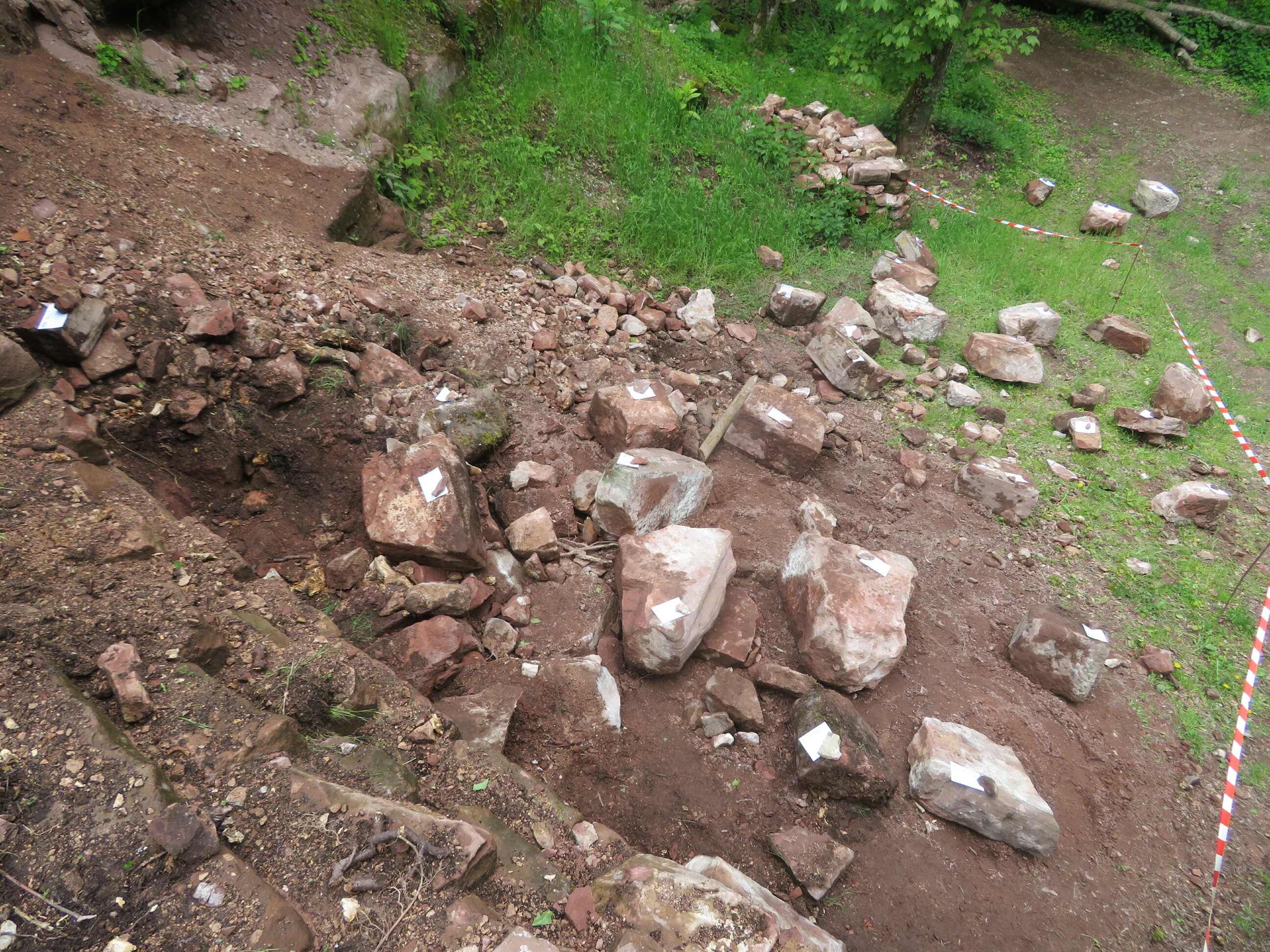 Suite au sondage réalisé par la DRAC et les MH en juillet 2021 constatant que le parement intérieur du mur d’enceinte était sain il a été convenu que nous pourrions décaisser tout le talus. Cela nous a permis de récupérer les blocs à bossage et surtout de mettre à jour le parement intérieur qui présentait bien une base saine mais dont les assises supérieures étaient très mal en point voire absentes.
