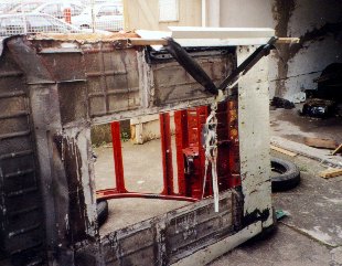 On peut raisonnablement penser que c'est du vrai bricolage ... en effet il vaut mieux apprendre à souder, et faire les choses dans les règles de l'art. Mais bon, j'avais commencé, ... j'ai été jusqu'au bout. Je ne sais toujours pas souder et surtout je n'ai pas de poste à soudure. Comme vous l'avez vu plus haut, il y avait pas mal de rouille et surtout, évidemment, dans des endroits complètement inaccessibles. J'ai toujours veillé à ne jamais mettre une tôle sur une autre, même peinte, sans intercaler une couche de goudron. En effet j'ai peur que l'eau stagne par capilarité entre les deux tôles qui se touchent. Je croyais, naïvement, qu'il suffit de poser une plaque de goudron sur la tôle, en la chauffant au chalumeau ... que ça va bien coller, qu'il n'y aura pas de vide ... Ben non, les tôles ne sont pas toujours plates, le goudron varie en épaisseur, etc. Je l'ai fait uniquement pour le plancher plat avant, sous les pieds, intérieur et extérieur. Comment faire pour enrober, au plus serré, les marche-pieds d'une tôle ? J'avoue avoir passé pas mal de temps à les comtempler, perplexe, à imaginer toutes sortes de stratagèmes. J'avais accès, à mon boulot, à une plieuse. mais comment plier une tôle en escargot ? Et surtout comment l'"enfiler" sur les marche-pieds sans la redéplier ? Je ne voulais pas non plus le faire en deux morceaux avec un joint sur le dessus ... C'est pas joli et surtout pas étanche.En plus, comme le dessous de la caisse était assez mal en point je voulais réaliser un beau pansement étanche par en dessous, ce jusqu'au renfort à 10 cm de l'arête.Tout ça en y versant du goudron chaud ... Voyons tout ça en photo.